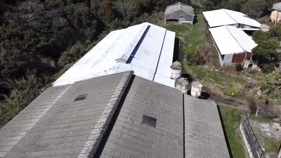 こちらは塗料で白くなってるのではなく、牛舎のスレート屋根の汚れを高圧洗浄機で落としている様子になります。